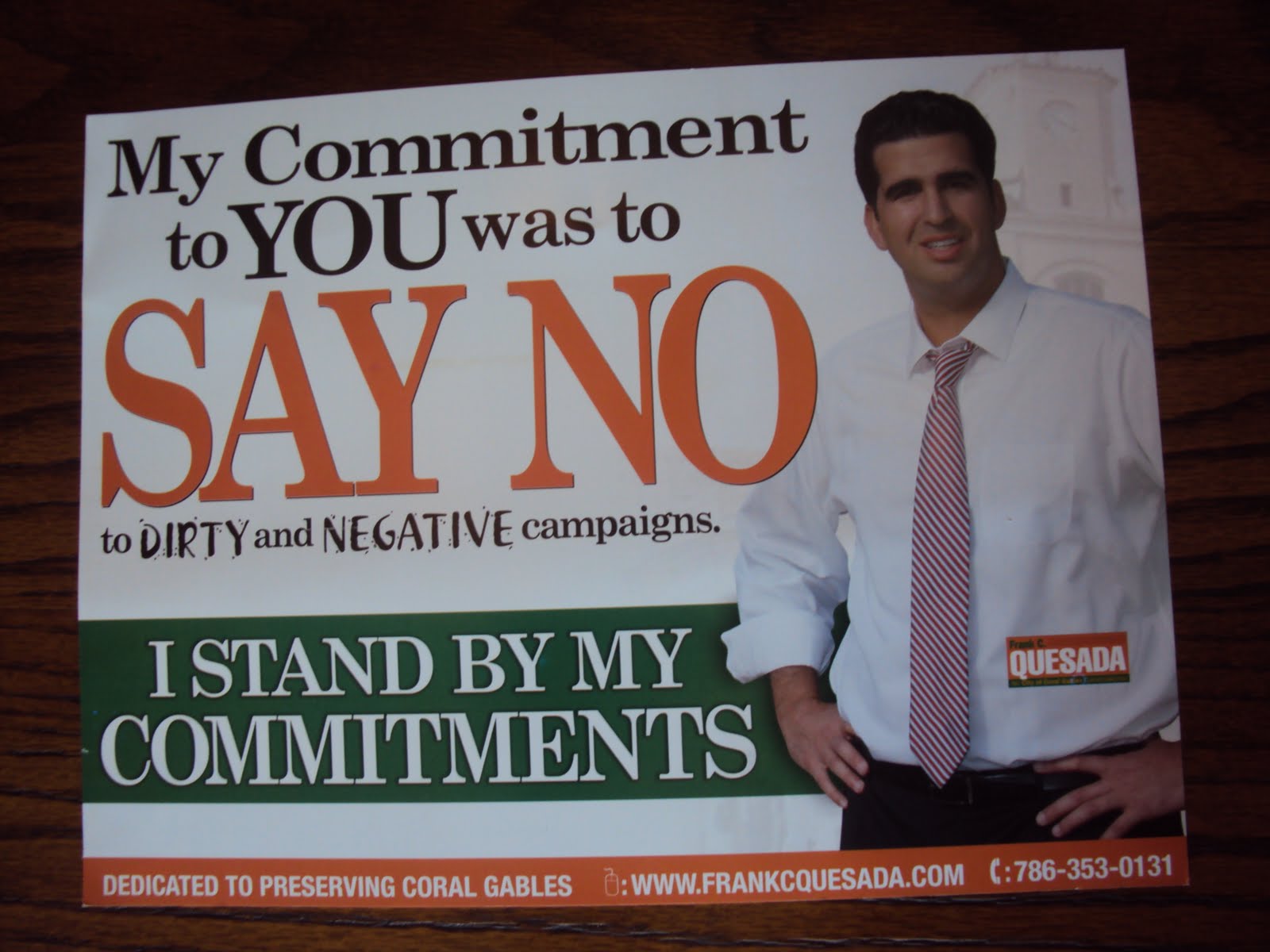 have aides). He also served on the city’s traffic advisory board and is on the board of directors of the Coral Gables Community Foundation, where the mayor and his wife Jeannett have both served as chair of the board. Quesada is young, 31, and tall and gorgeous and his wife and family are beautiful. He has the blessings of Kerdyk, Withers — who gave his endorsement just a couple of weeks ago — and former mayor Raul Valdes-Fauli, in whose law firm the young Cuban Kerdyk worked. In his first campaign for office, Quesada — who promised to stay clean and has, but keeps reminding us that he has — raised $104,000. In addition to financial support from Valdes-Fauli, he has $500 donations from Miami Commissioner Francis Suarez, Carlos Lacasa, Carlos Trujillo. That is a very respectable amount for a freshman and more than Gonzalo Sanabria, who lost to Maria Anderson in 2009 and raised a total of $63,400 reported as of Friday. But if you look closely, Sanabria — who more transparently loaned himself $100,000 for his bid two years ago — padded that last report with $23,000 in four contributions from himself. Perhaps he did not want to be seen as someone who only got $40,000 in donations, especially if he could not pull in another $10,000 in that last quarter after so much negative press for his main opponent. Sanabria, who and spent at least $124,000 in the election two years ago, is not going to be able to get that kind of traction and would have needed it even more (people still hold a grudge from 2009) and that is why we have him at a solid three. He could go down, but not up.