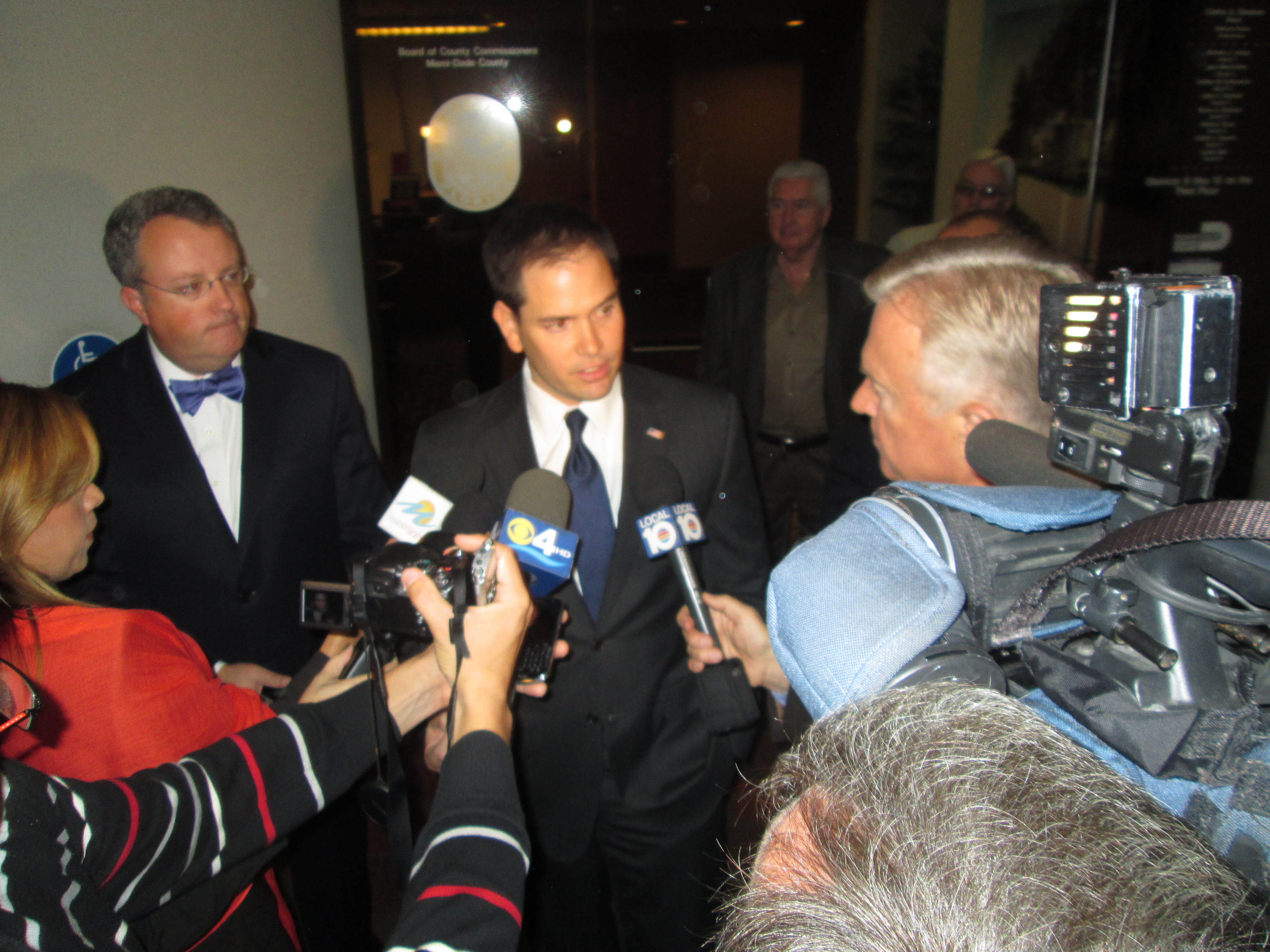 Rubio, on the other hand, did not talk. At the ceremony, that is. He gave several soundbites when he was besieged by cameramen just outside as he tried to escape. They asked mostly about immigration reform, in which he has a high profile role, and the proposed rescindment of the Cuban Adjustment Act. But he did mention his old friend when one TV face asked.