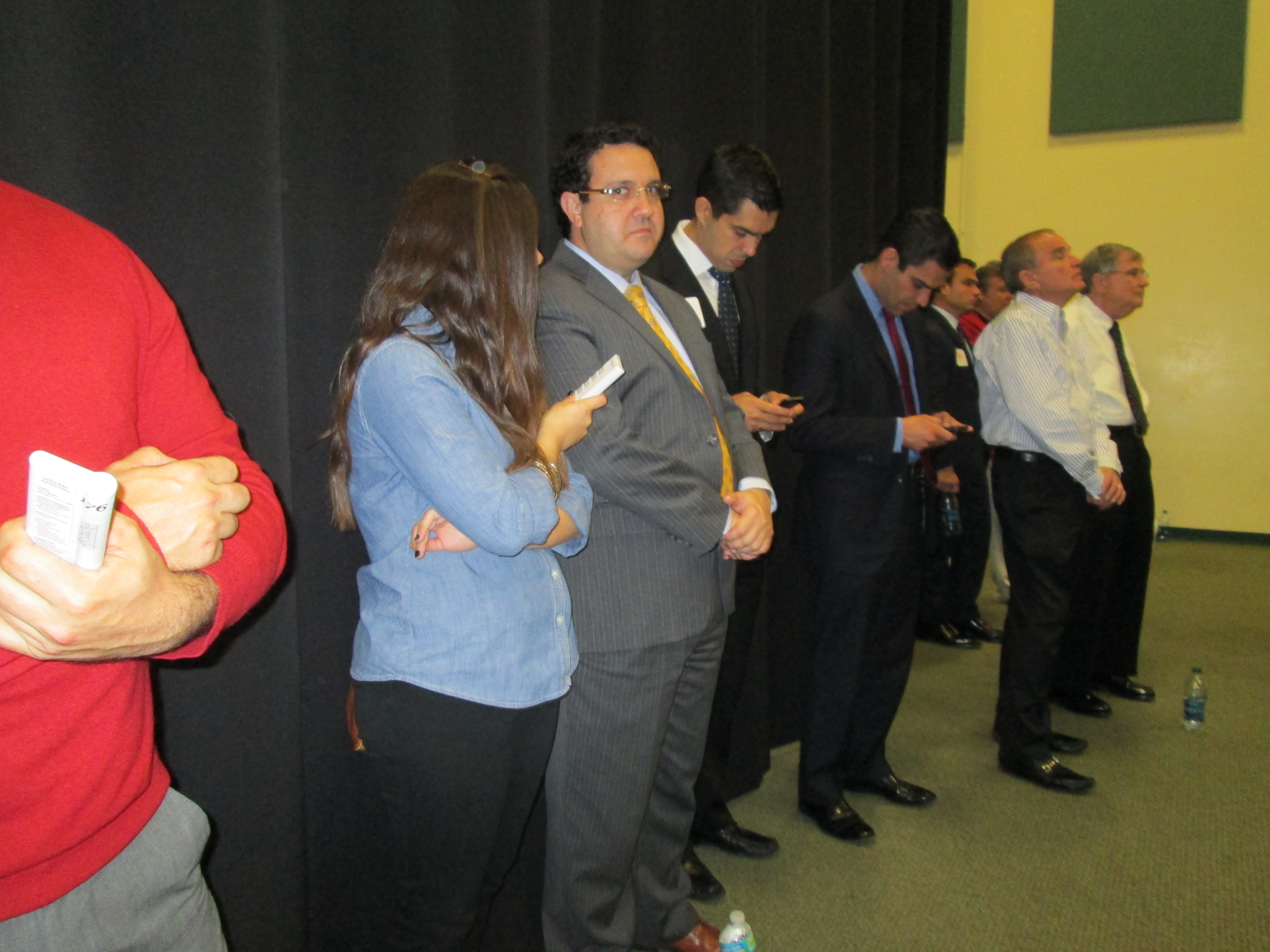 Suarez stuck around to watch the mayoral debate between Cabrera and Mayor James Cason, though he spent a bit of that time chatting with Lago and texting (to Lago?).
