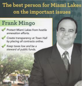 Mingo only beat the second council candidate, Lorenzo Cobiella, by 120 votes, despite having more money and PACs and Oliva’s campaign go-to boy David Custin (who didn’t go negative but really didn’t have to) and his aforementioned godfathers. He got 1,337 votes to Cobiella’s 1,217. But Mingo had more money to spend, with more than $22,000 in his piggy bank compared to Cobiella’s $15K. And that is just in his personal campaign account. The PAC advocating for Mingo, Citizens for Ethical and Effective Leadership, reported raising $122,000 and spending at least $34,000 by Sept. 24. The increasing PAC activity in Miami Lakes has become a concern for some residents who question why so much Miami Beach and other outside money is interested in their little town. But Custin could use the PAC for other races and he is working on the Beach mayoral campaign of Philip Levine, too, so there’s that.