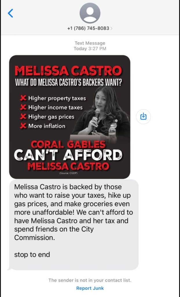 The dark money forces that attacked Coral Gables Commissioner Elect Ariel Fernandez before last week’s election have turned their focus to Melissa Castro, a mental health worker and permit expediter who made the runoff in the Group 4 race with text messages that say she’ll raise income tax and gas and grocery prices.