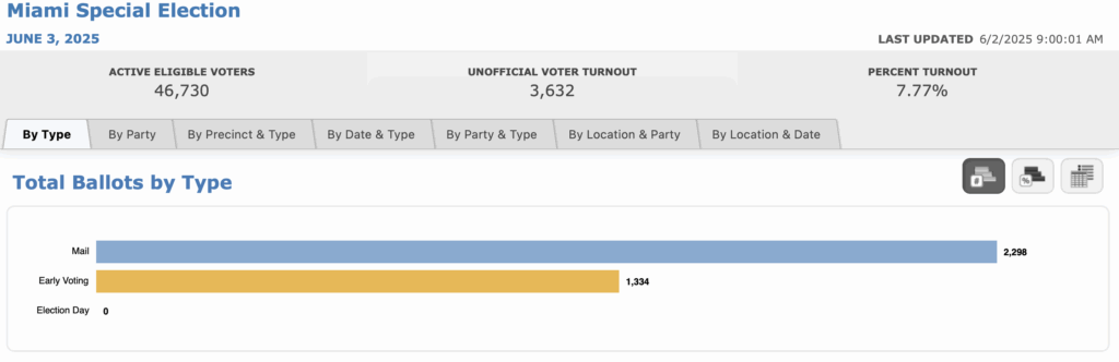There are 46,730 registered voters in city commission District 4. Of those, only 3,632 have voted via absentee or vote-by-mail ballot (2,298) and the three days of early voting (1,334) that ended Sunday. Turnout is not expected to be very much above 10%, if it reaches that. If 5,000 people vote, that means that .01 percent of the population of the city of Miami will decide the victor.