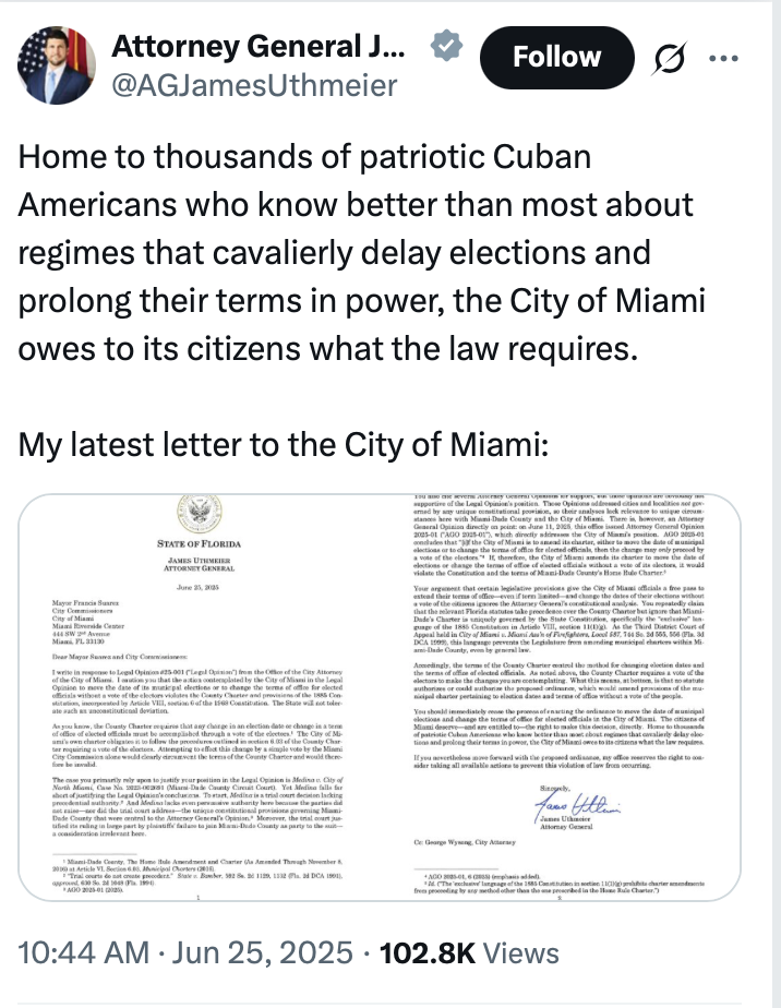 Uthmeier also posted his letter on X, the platform formerly known as twitter. “Home to thousands of patriotic Cuban Americans who know better than most about regimes that cavalierly delay elections and prolong their terms in power, the City of Miami owes to its citizens what the law requires,” Uthmeier wrote.