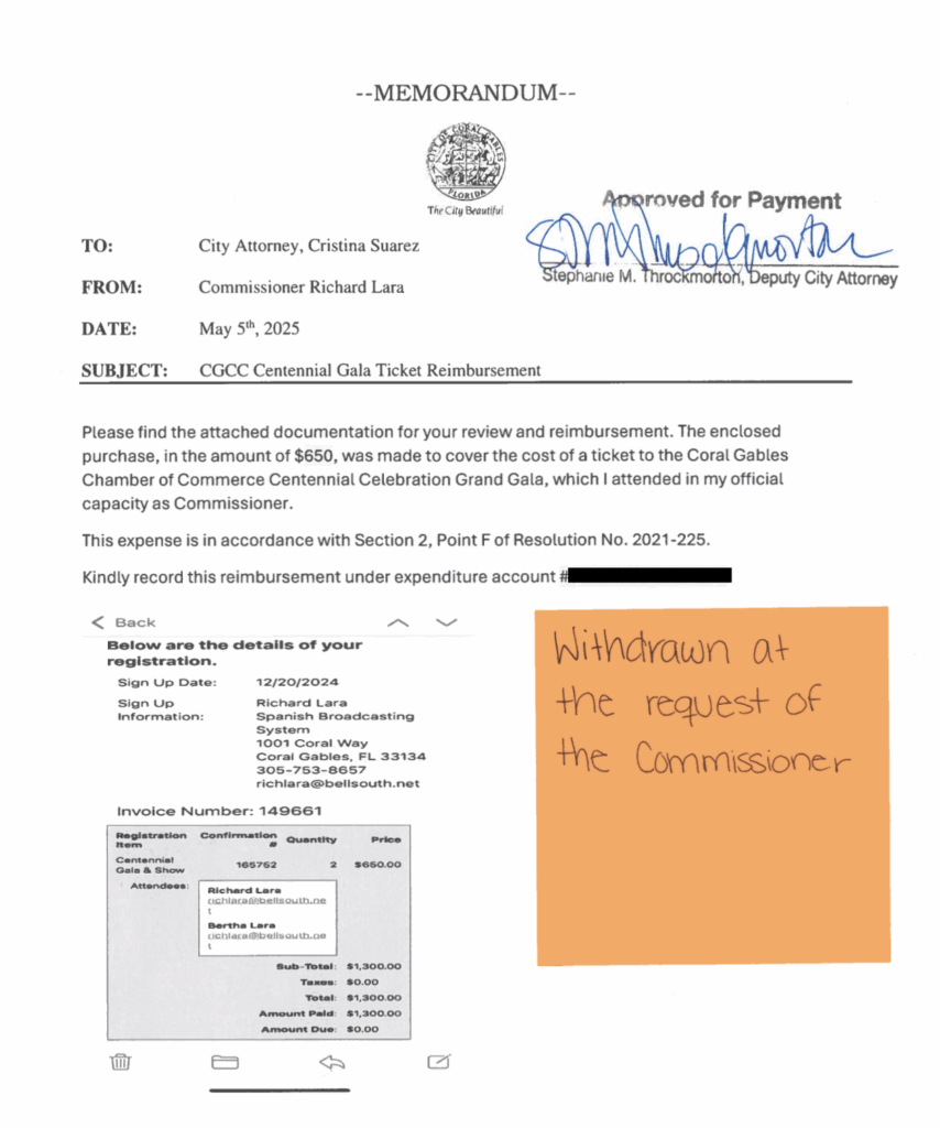 Coral Gables newly-elected Commissioner Richard Lara — who repealed the prior commission’s increased salaries and talks a lot about fiscal responsibility — tried to nickel and dime the city himself with a reimbursement request for a ticket he bought to the Coral Gables Chamber of Commerce’s Centennial Gala. A ticket he bought before he was elected.