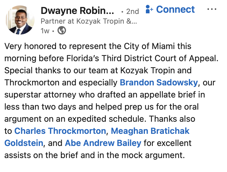 $2,350 an hour when they’re working together. And it is a team effort, that even put on a mock trial, according to Robinson’s LinkedIn post from last week. That’s dedication.