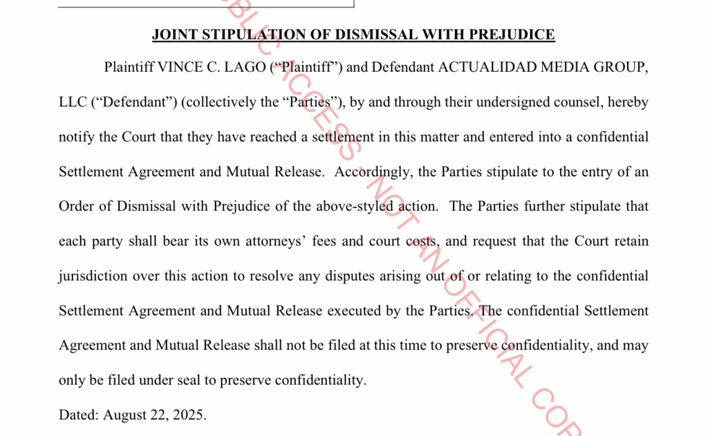 Both Lago and Actualidad Media notified the court Aug. 22 that they had “reached a settlement in this matter and entered into a confidential settlement agreement, which was sealed “to preserve confidentiality,” the document reads.