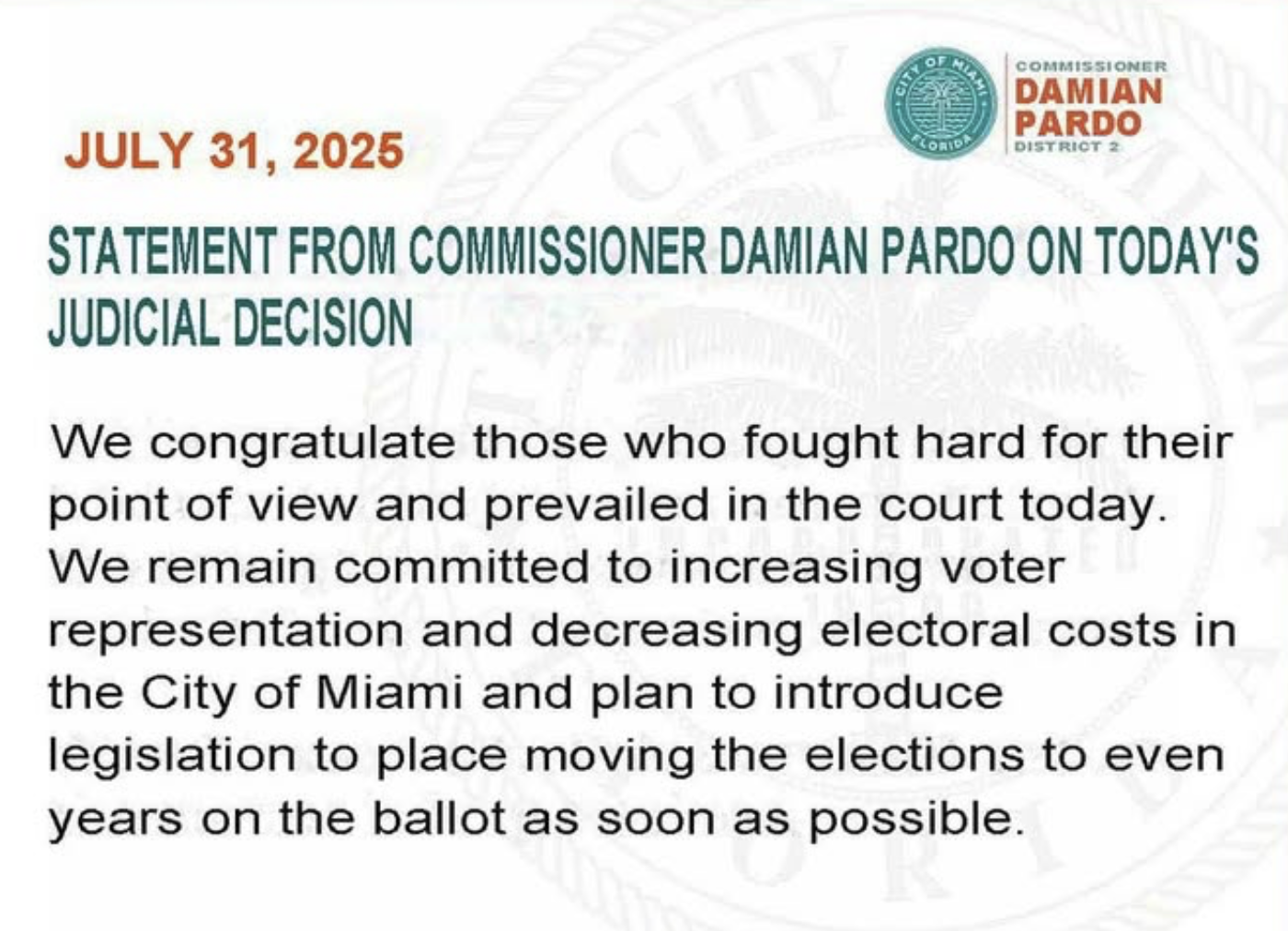 It was kind of unexpected for the city to appeal the Third DCA decision to begin with. Pardo, who pushed the measure because it was tied to his lifetime (but not for everyone) term limits, issued a statement the same day of the ruling, congratulating “those