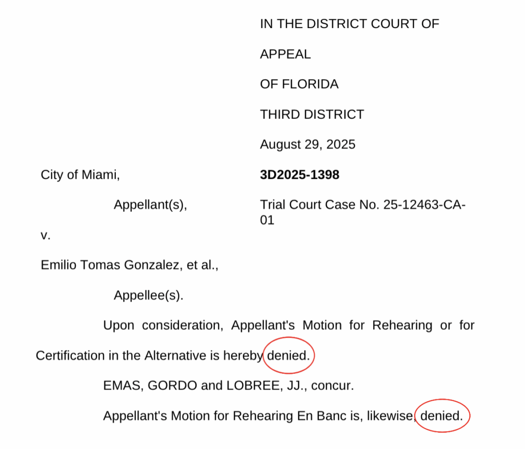 After losing in circuit court and then getting their appeal slammed by the Third District Court of Appeals July 31, city officials went right back on Monday and filed yet another motion for rehearing — still trying to justify their illegal power grab to cancel elections and keep a term-limited mayor and two commissioners in their seats for another year.