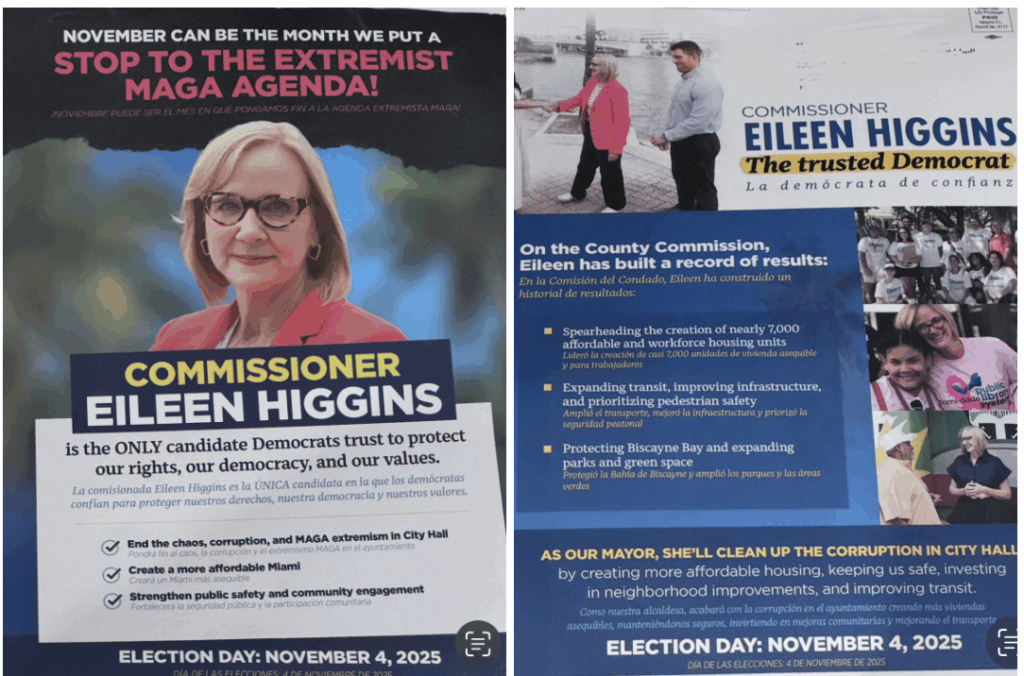 On one side, it says “November can e the month we put a stop to the extremist MAGA agenda,” and “Commissioner Eileen Higgins is the ONLY candidate Democrats trust to protect our rights, our democracy and our values.” It also says she will end the “chaos, corruption and MAGA extremism.”
