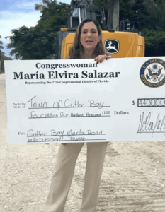 A few days ago, the rarely-seen congresswoman made one of her once-in-a-blue-moon visitas públicas to the district — this time to Cutler Bay — to smile wide and brag about delivering a $4.4 million check for local road projects, public safety improvements, and coastal resilience work. Signed by herself. From her office.