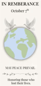 hung instead of the Israeli flag. What they came up with is two white doves over the Earth and underneath the date Oct. 7. The messages “In Remembrance,” “May Peace Prevail” and “Honoring those who lost their lives” are also on the banner.