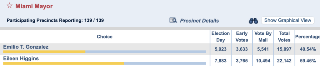Neighborhoods from Allapattah to The Roads, from Little Havana to Coconut Grove, from Flagami to Brickell — they all turned out for Higgins, who had the momentum coming out of Election Day with double digits over Gonzalez (36% to 18%). And Democrats, independents, Republicans-who-stopped-recognizing-their-own-party, and thousands of NPA voters all combined to give her a real, honest-to-God mandate Tuesday.