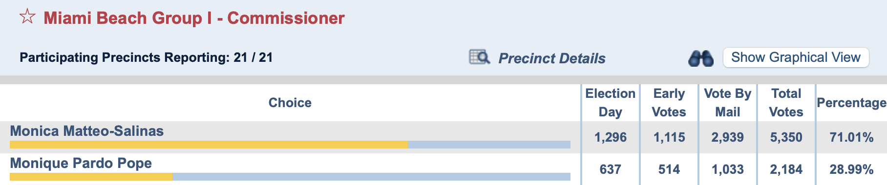 Monica Matteo-Salinas didn’t just win. She got more than twice as many votes in every single category — vote-by-mail, early voting and Election Day — and earned the runaway margin by running a clean, competent, resident-focused campaign while her opponent got swallowed by her own credibility problems. Miami Beach voters may be quirky, but they know when someone isn’t ready for prime time.