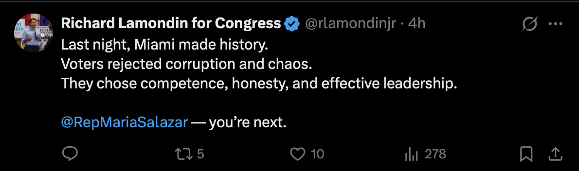 Gonzalez and others — even President Donald Trump — who couldn’t pull enough votes for former city manager Emilio Gonzalez in the Miami mayoral race. They lose not just because Miami voters have no patience for Tallahassee and D.C. meddling in our local races, and by know they should know that. But also because this does not bode well for them in 2026. Congress members Carlos Gimenez and Maria Elvira Salazar are also likely taking lots of acetaminophen today — even if their Dear Leader can’t pronounce it. - Local Republican leaders are also grabbing some ibuprofen today. I would not want to be at the drive-up window Wednesday when Kevin Cooper or Liliana Ros or Evan Power roll through.