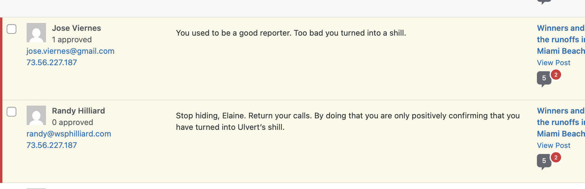 - Former Joe Carollo district aide Steven Miro, who filed a whistleblower suit against his ex boss after he said he was fired in retaliation for reporting that the commissioner used his office and public dollars to campaign for Alex Diaz de la Portilla when the latter was running for county commission. The scandal became known as Paellagate and Miro eventually settled out of court for a tidy sum. Fast forward to this election cycle, where helped Escalona — a lot. It was personal for him. We might want to put other former Carollo staffers on the list. Let’s make that the Anybody-But-Joe coalition. Anyone who
